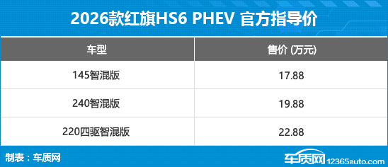 12月16日,红旗旗下全新车型HS6 PHEV崇拜上市,新车共推出3款车型,官方率领价为17.88-22.88万元。同期,官方还推出开拔礼、智享礼等多项购车限时权柄。