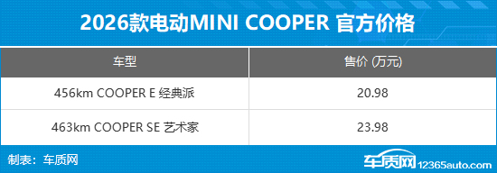 12月17日,2026款电动MINI COOPER崇拜上市,共推COOPER E经典派、COOPER SE艺术家两款竖立。价钱方面,新车提议零卖价20.98-23.98万元,即日起至2025年12月31日,限时礼遇价低至15.38-18.78万元,还可重叠多重福利:指定车型车身神采加装费至高全免6000元、享至高8000元选装包抵扣金;金融有谋略撑握首付0元起,年利率低至4.28%(约合年费率2.26%),由衷客户更有6年长悦爱护套餐,个东说念主预订/提车可获826 COOPER币。